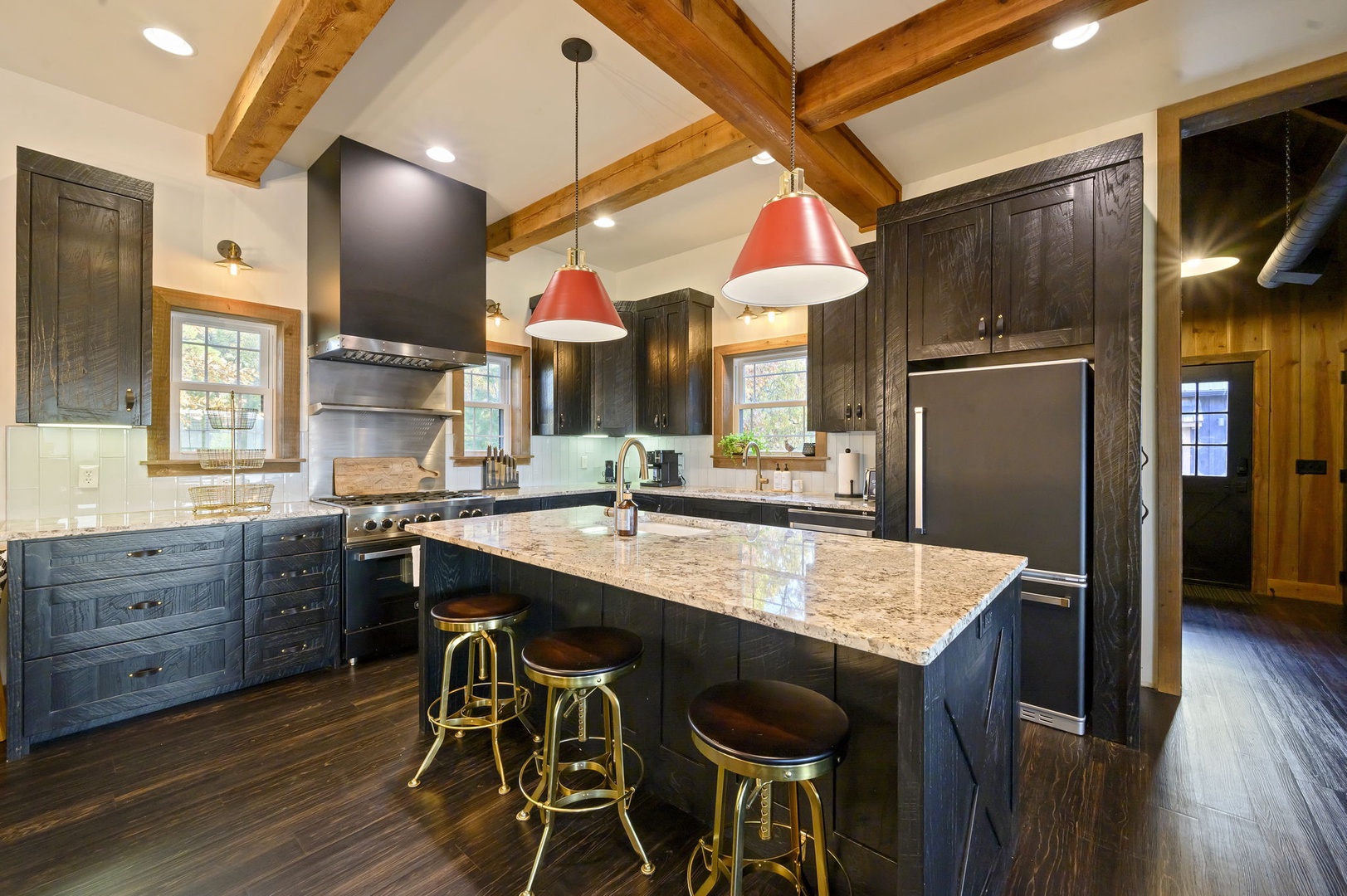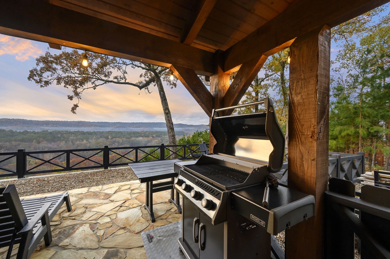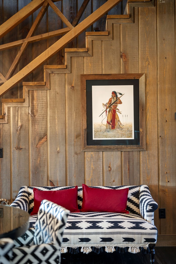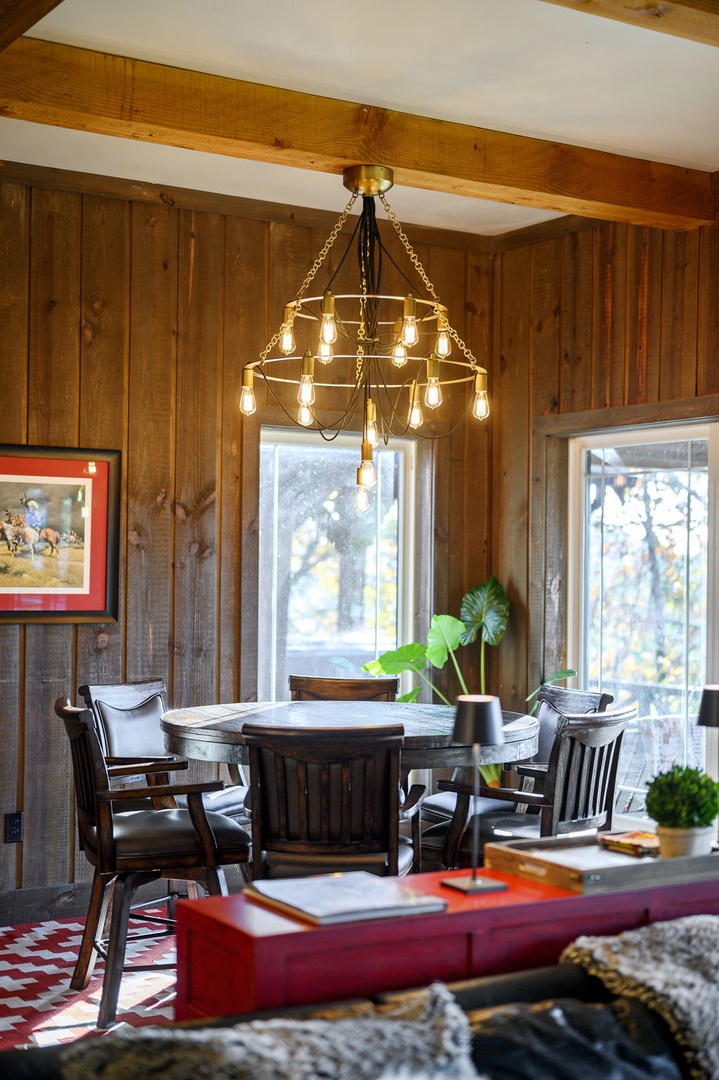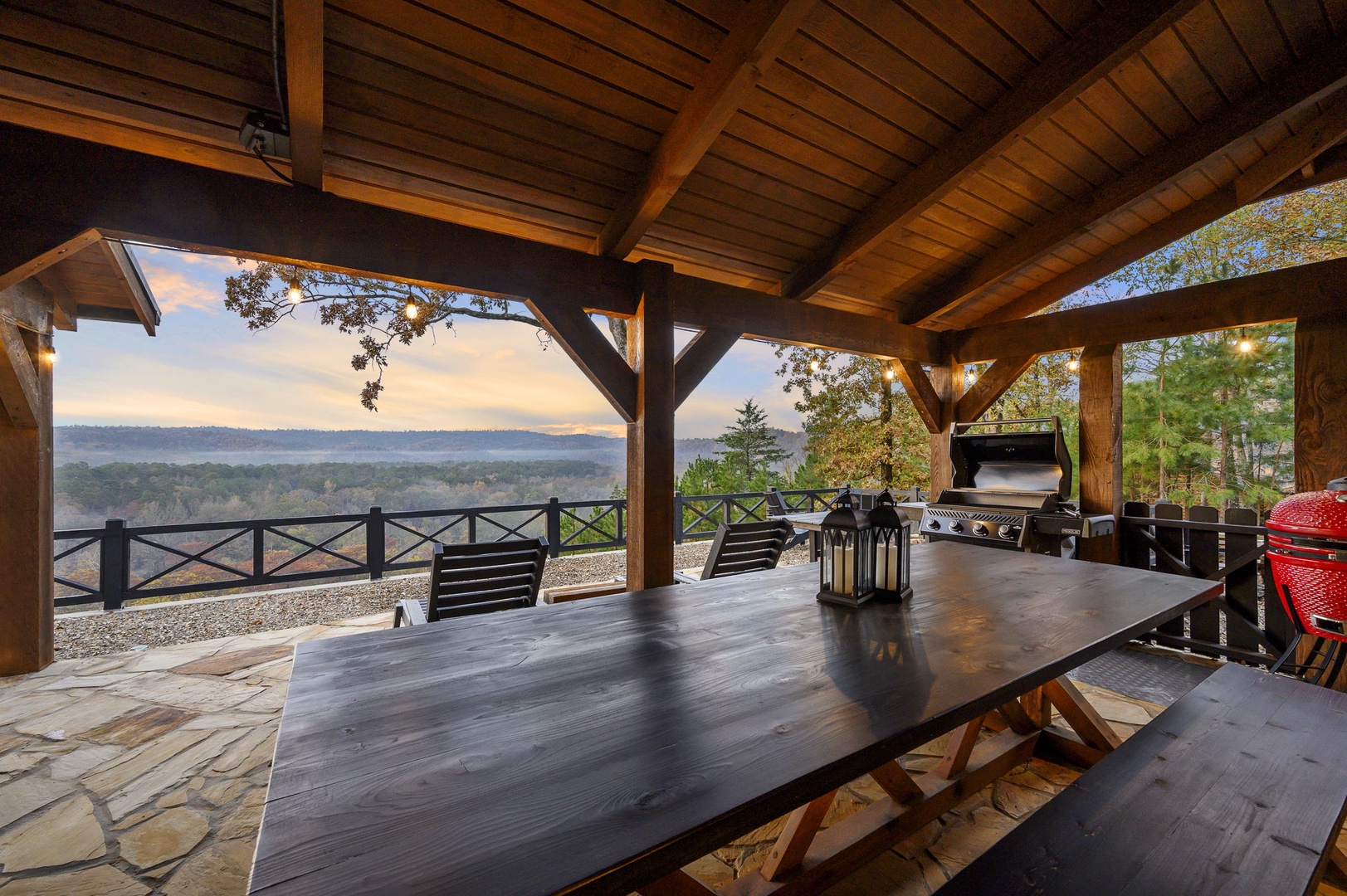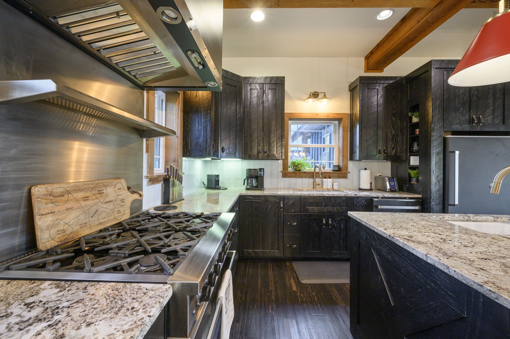 The chef’s kitchen includes gas appliances, a prep sink, and all cookware needed to create memorable meals. Mornings are easy with drip, Keurig, and Nespresso coffee options available. Dine inside or outside beneath the covered patio, complete with a handcrafted table for eight, a Napoleon 4-burner grill, and a 24” Louisiana Red Egg smoker (bring your own lump charcoal).