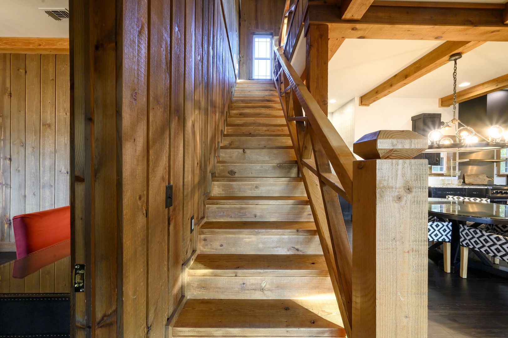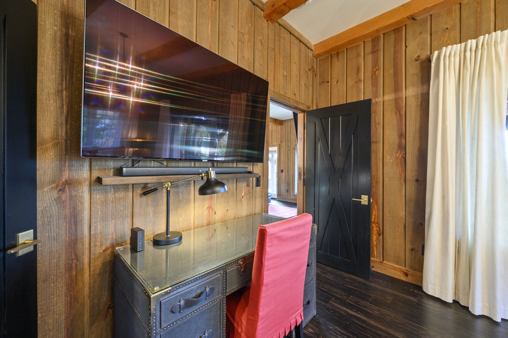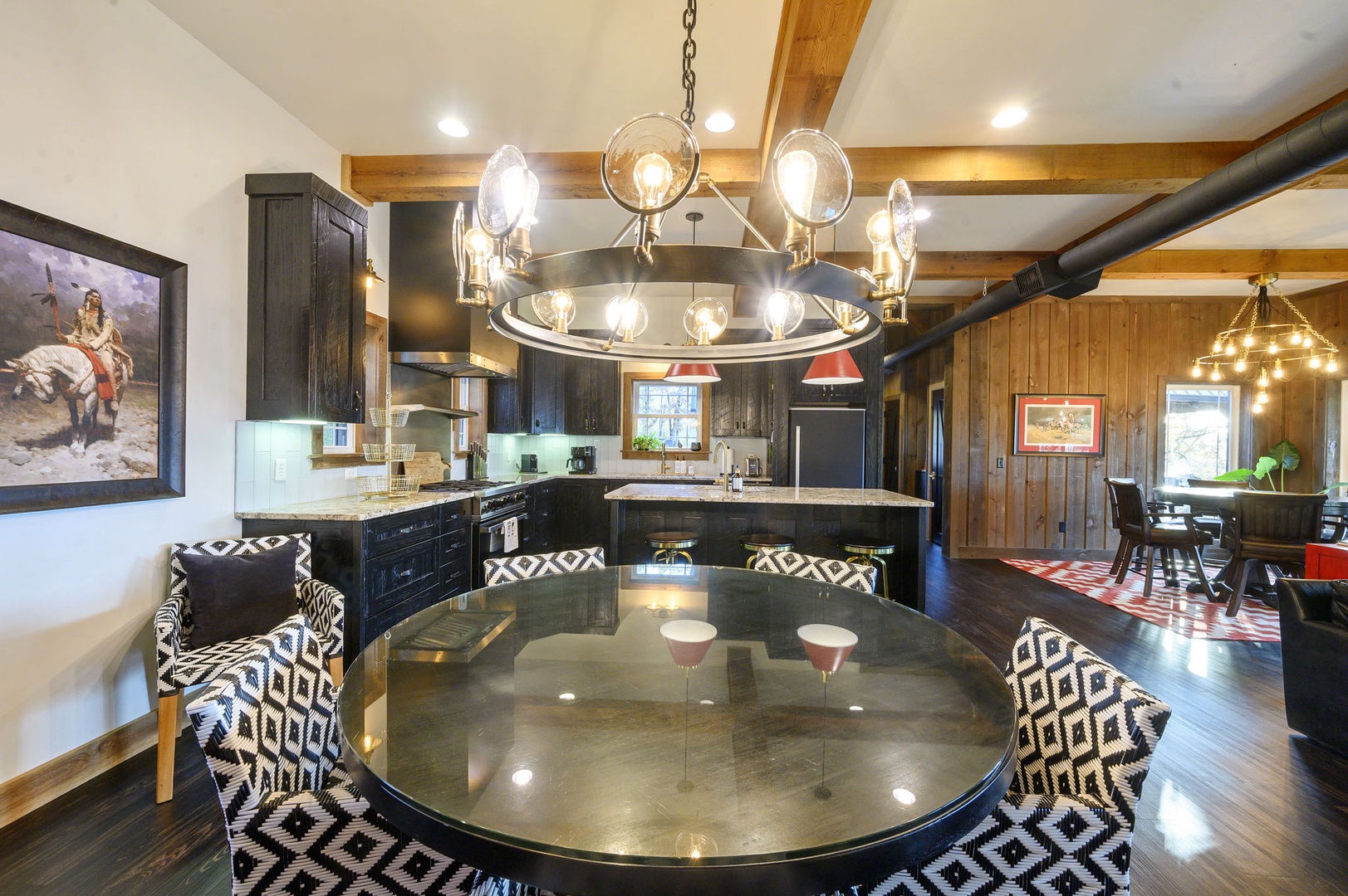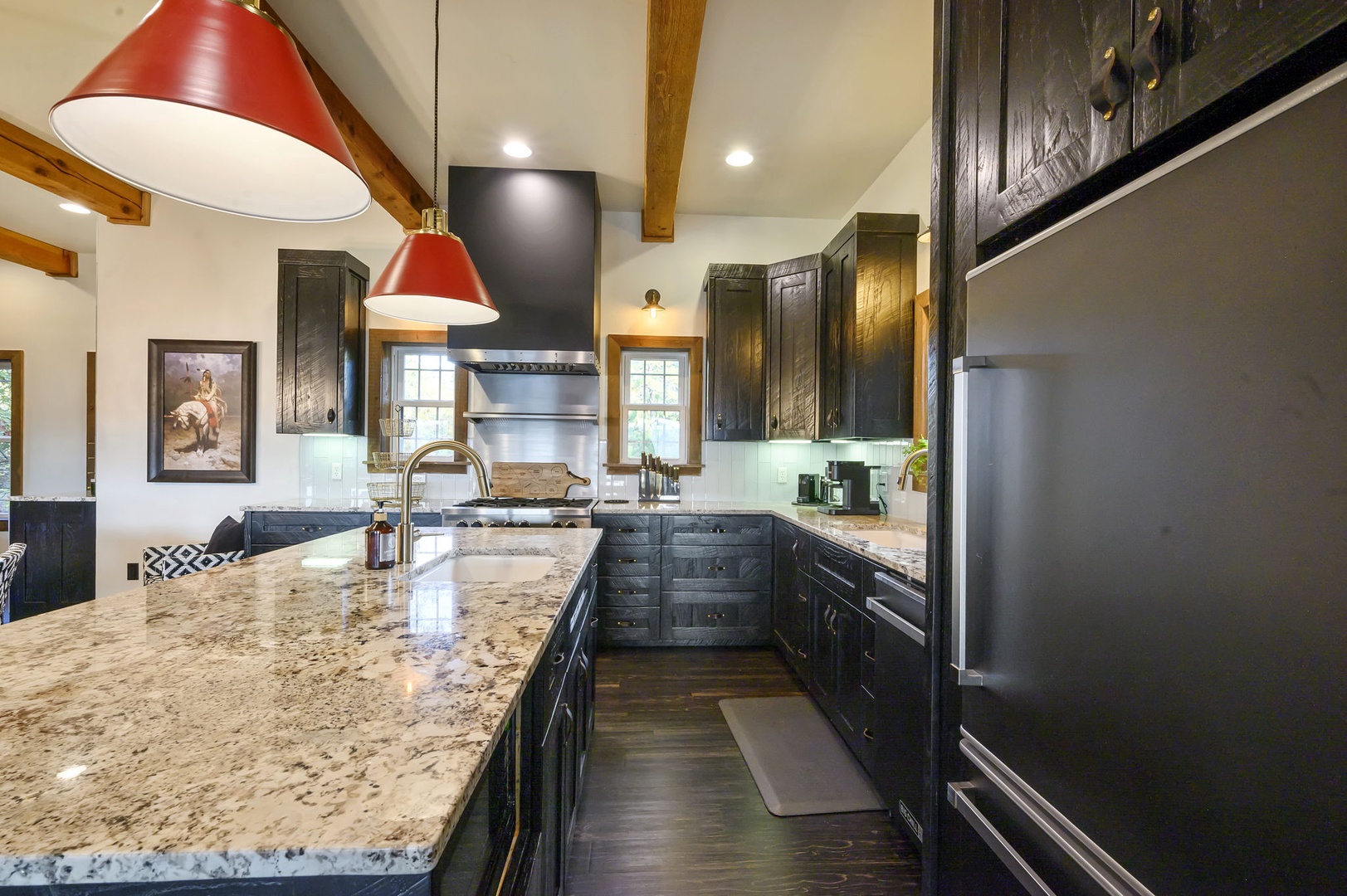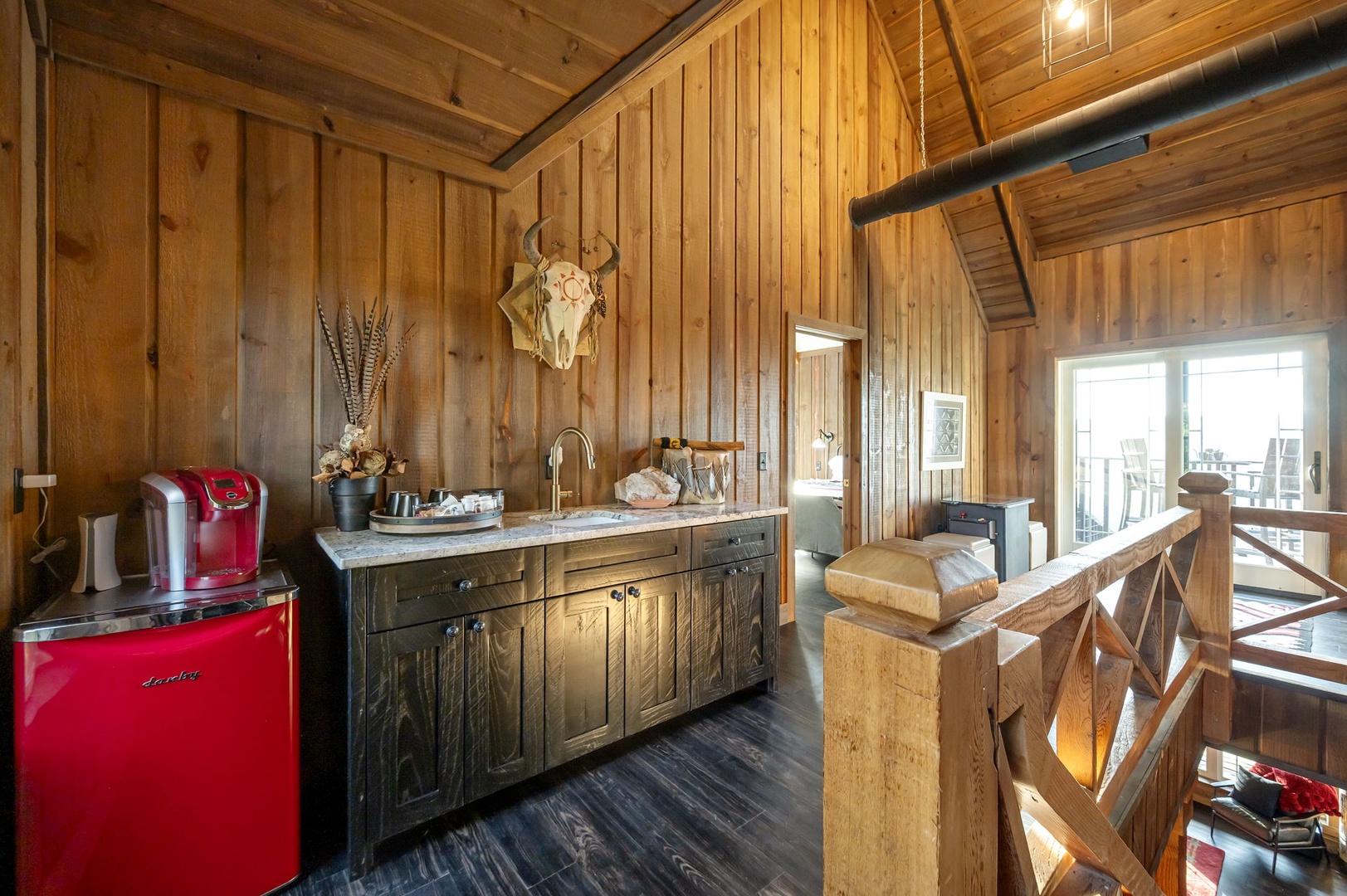 The chef’s kitchen includes gas appliances, a prep sink, and all cookware needed to create memorable meals. Mornings are easy with drip, Keurig, and Nespresso coffee options available. Dine inside or outside beneath the covered patio, complete with a handcrafted table for eight, a Napoleon 4-burner grill, and a 24” Louisiana Red Egg smoker (bring your own lump charcoal).