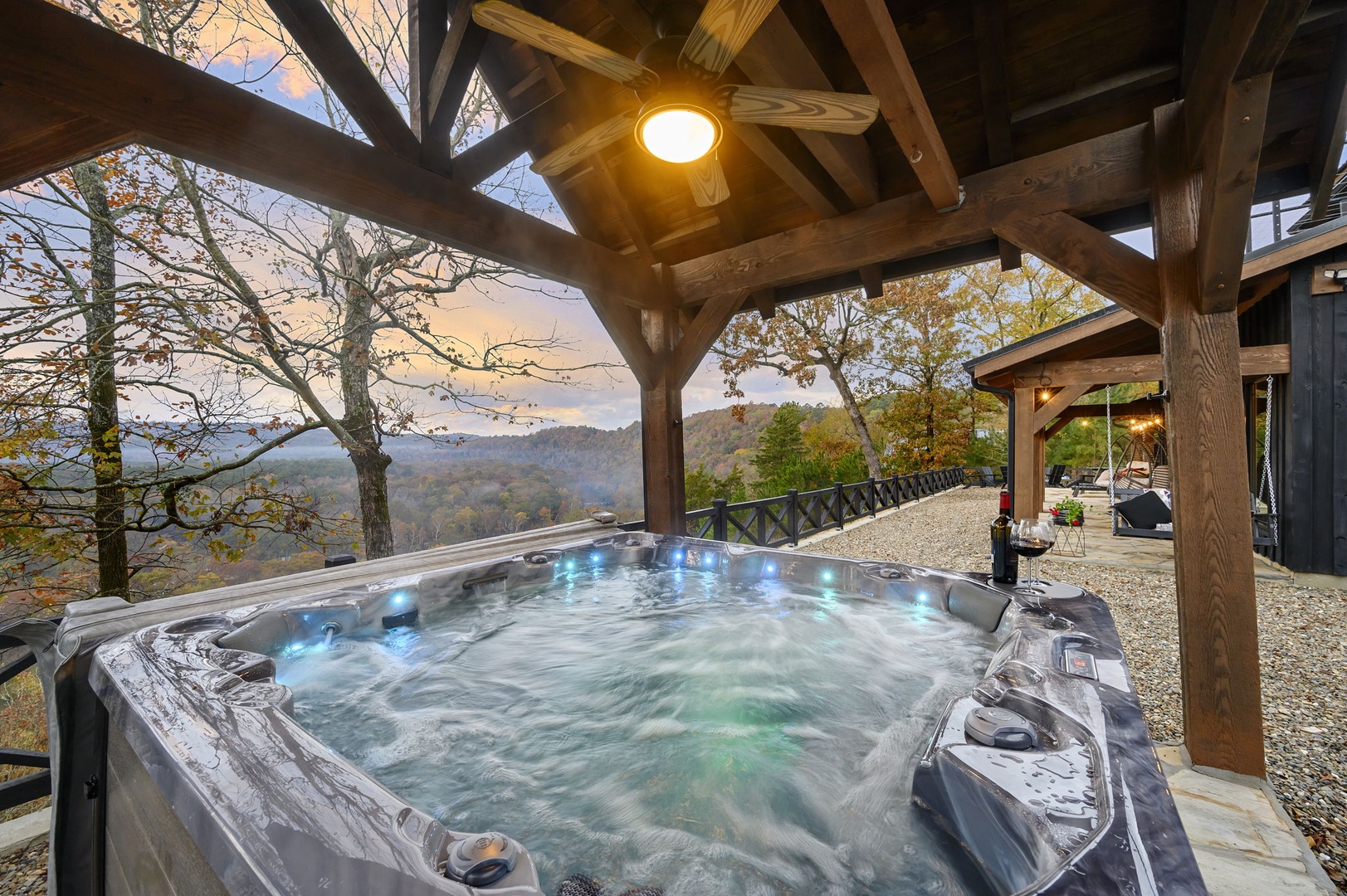 The expansive outdoor living spaces include a full-width main-level patio and two upper balconies—perfect for sunrise coffee, sunset wine, or simply soaking in the views. The private hot tub shares the same breathtaking views. The yard provides plenty of open space for cornhole, drone flying, and cozy evenings by the fire pit.